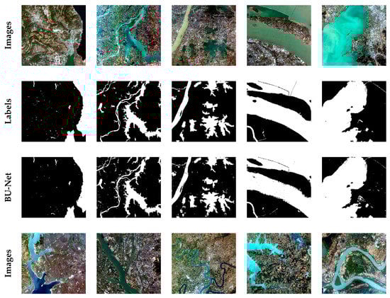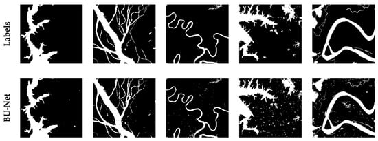 The visualization results are shown in Figure 3. It can be seen that the BU-Net performed very well on the 10 test images; such water bodies as a slender river, a large area of continuous lakes or even islands, reefs and boat branches in the water body were accurately identified and distinguished. Accuracy ranged from as high as 99.52% to as low as 96.78%. The F1-score ranged between as high as 99.73% and as low as 97.91%. IoU was as high as 99.54% and as low as 95.90%. In terms of overall average values, Accuracy was 98.31% on average, while the F1-score averaged 98.89%, and the average IoU was 97.81%; see Table 2 for more detailed evaluation data of BU-Net. Of course, a comparison with the label map reveals the persistence of many problems, such as many isolated pixels that are misclassified as a whole in the image. In addition, the model tended to confuse the three pixels in the area near buildings and vegetation and water, and some slender rivers were identified as discontinuous and disconnected (see Figure 4). Nevertheless, overall, the BU-Net network structure offered high prediction accuracy.