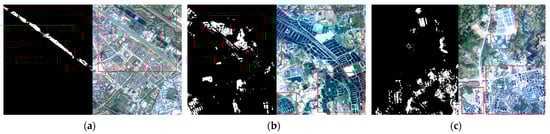 Remote sensing images misclassified by BU-Net: (a) Slender rivers that are identified as discontinuous; (b) paddy fields that are misclassified as water bodies; and (c) industrial and residential land that are misclassified as water bodies.