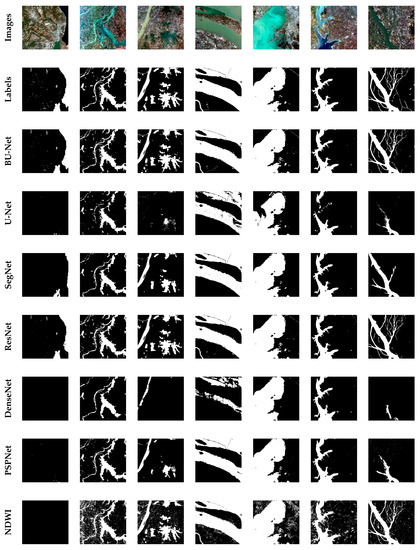 In order to more comprehensively analyze and evaluate the performance of BU-Net in water body recognition, five network structures (U-Net, SegNet, ResNet, DenseNet and PSPNet) and NDWI method were built to compare their classification effects (see Figure 6 and Table 4). U-Net and DenseNet showed the poorest performance of all of the networks. They could only identify some obvious water bodies and lacked the ability to identify water bodies having a dark color, turbid water quality or low contrast with adjacent areas. In comparison, while PSPNet and SegNet could identify the general outline of the water body in the image, finer details, such as small rivers and water body outlines, were still relatively vague. ResNet and BU-Net performed very well in terms of water body recognition. There was almost no difference between the predicted image and the label image, but some buildings and vegetation pixels similar to water bodies were still misclassified, resulting in many isolated pixels. Furthermore, this phenomenon was more obvious on BU-Net. In the future, we hope to solve this problem from the perspective of image morphology and further improve the prediction accuracy of BU-Net.