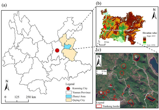 A location map of the karst tiankeng group area. (a) Location map (province, city and district) where the study area is located; (b) Elevation map of Zhanyi district; (c) Schematic diagram of Zhanyi Tiankeng Group. Red circled areas are the border of different tiankengs. B means Bajiaxiantang tiankeng, S means Shenxiantang tiankeng.