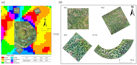A schematic map of the samples. (a) Location map of tiankeng samples. Red border lines are samples. S1 and S2 are samples inside the tiankeng. SG1–SG3 are samples outside the tiankeng. WSW means the west-southwest slope, NEN means the north-northeast slope, and WS means the southwest slope. (b) Samples of tiankeng-inside and tiankeng-outside.