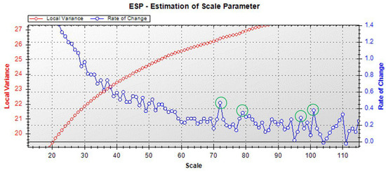 The optimal segmentation scale is estimated by using the Estimation of Scale Parameter (ESP) plug-in of the eCognition software. The ESP algorithm starts with a single pixel as an object and then iterates up the process species. Smaller image objects are merged to become larger image objects, and the minimized objects with internal homogeneity are obtained by continuous optimization [39]. The algorithm determines the best segmentation scale by calculating the rates of change (ROC) from the local variance (LV) of the image object [40]. When the ROC value is maximum, the segmentation scale corresponding to the peak presented is the optimal scale [27]. The shape and tightness parameters need to be tested repeatedly to obtain the best results. The optimal scale parameters are filtered by experiments comparing control variables using a multi-scale segmentation algorithm for optimal values of shape and tightness parameters. During the preliminary tests, we found that the optimal division scale ranged roughly from 10 to 200. Then we set the starting scale in the ESP plug-in to 10, the step size to 1, and the shape and tightness parameters to 0.5, with 200 cycles to finally obtain the segmentation parameter evaluation plots.