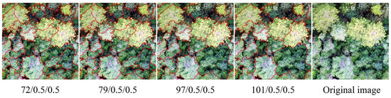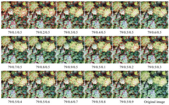 The alternative optimal segmentation scale parameters were 72, 79, 97, and 101 (Figure 3). Select default values for shape and compactness parameters to obtain visually correct segmentation results (Figure 4). Comparing the segmentation line with the original canopy shape on the image, we found when scale = 79, the edges of the tree canopy were well outlined. When the scale < 79, there was a case that a tree canopy was divided into multiple objects, and when the scale > 79, some of tree shadows were mixed with the canopy. Thus, the optimal segmentation scale parameter was determined to be 79. The best shape and compactness factors were then screened by comparison tests of control variables, which allowed for 17 sets of segmentation results (Figure 5). It was found that the best results were obtained when the shape parameter was set to 0.5 and the compactness to 0.8.