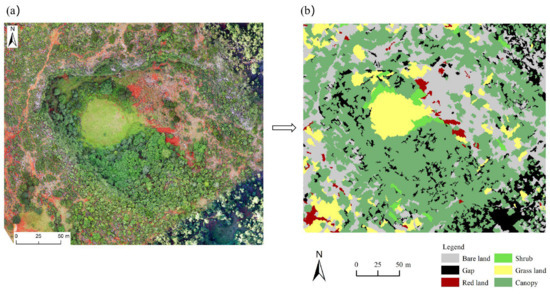 Using the same method, we also extracted the canopy of another tiankeng (Bajiaxiantang) (Figure 7a). The best segmentation parameters were 63 (scale), 0.5 (shape), 0.2 (compactness). The land cover of classification results based on the optimal feature combination using the k-NN classifier were shown in Figure 7b. It was divided into six types: grass, shrub, red land, gap, canopy, and bare land. The training samples were selected for feature screening. The relationship between the number of features and the minimum feature distance between objects was calculated. We found that when the number of features was 7, each object had a good differentiation, and the computation was appropriate. The optimal combination of features was red, area, std. dev Green, std. dev CHM, EXG, NGBDI, length/width.