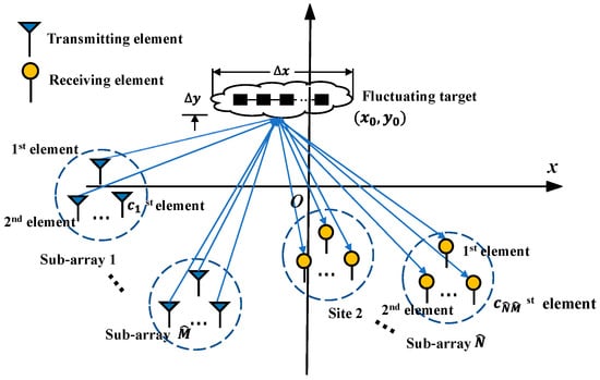 where target scattering coefficient matrix sub-block contains coherent processing channel. Figure 2 intuitively illustrates the array element configuration of the hybrid distributed PA-MIMO radar. M transmitting array elements and N receiving array elements are reorganized and divided into and subarrays, respectively. The transmitter subarrays and the receiver subarrays perform coherent processing as a phased array radar. Simultaneously, each subarray also transmits and receives independent orthogonal signals as a MIMO radar for diversity processing so that the radar system has coherent processing gain and space diversity gain at the same time.