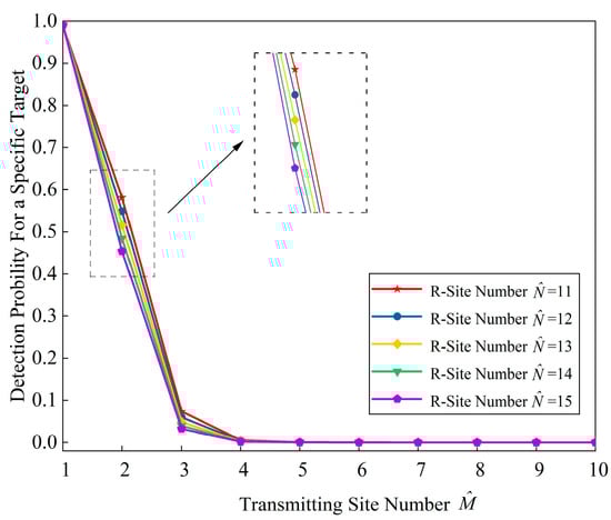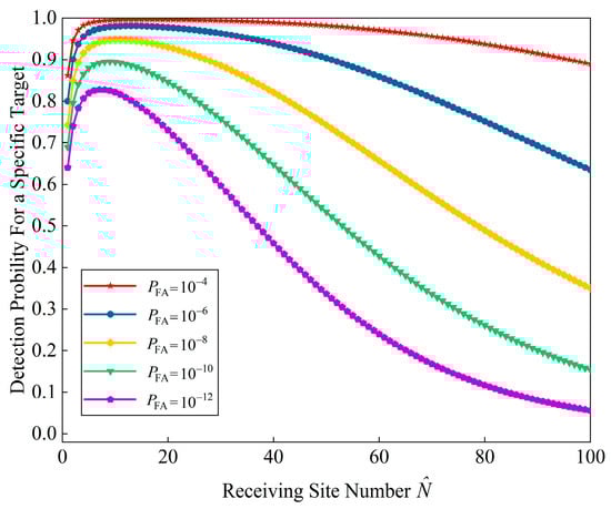 Similarly, Figure 6 depicts ’s effect on the detection probability with different . As shown in Figure 6, the value of significantly attenuates from 1 to almost 0 when increases from 1 to 4. Essentially, this is because the diversity at the transmitter side reduces the coherent processing gain, while the contribution of the spatial diversity gain is much smaller than the coherent processing gain.