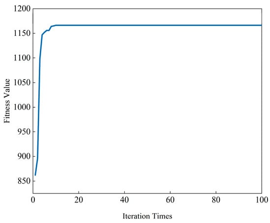 Assuming , for the hybrid distributed PA-MIMO radar system, the SR-QPSO optimization is applied to solve optimization problem 2 based on formula (42). The convergence of the fitness function is shown in Figure 8. With no more than 10 iterations, the effective range of the radar system converges to the optimum value of 1166.3 km. At this point, the optimal strategy for the array element configuration is .