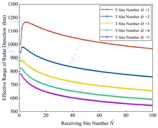 In Figure 9, we let and draw the value of effective range when varying in 1 and 100. It is clear that increasing the number of transmitter diversity DOF does not improve the range of the radar system compared to the optimal solution, but rather reduces the effective range. Moreover, the corresponding optimal transmit array division DOF for the transmit array division scheme decreases as the number of transmitter sites increases. This is still essentially a decrease in channel SNR due to transmitter side diversity. Therefore, the subsequent analysis will be based on the .