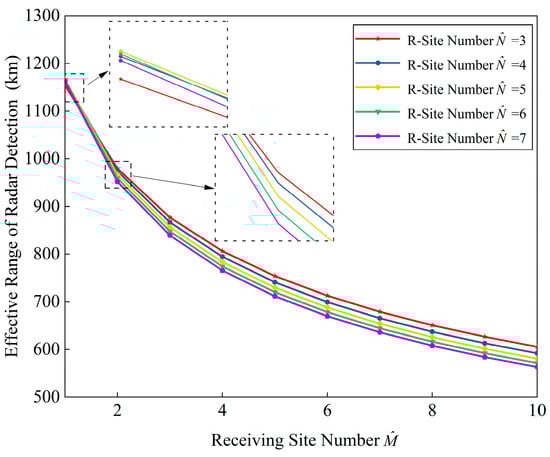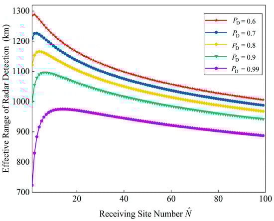 In Figure 11, with the fixed , the maximum effective range curves are calculated for the hybrid distributed PA-MIMO radar system with . It can be obtained that as increases, the effective action distance decreases accordingly. Secondly, the optimal receiver diversity DOF increases with the increase of the detection probability.