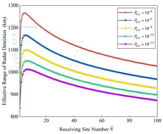 In Figure 12, the maximum effective range with are calculated for the hybrid distributed PA-MIMO radar system. Without loss of generality, the lower the false alarm probability , the shorter the effective range. By comparing with Figure 11 and Figure 12, it shows that has less impact than on effective range, but the optimal strategies all increase as the detection accuracy rises.