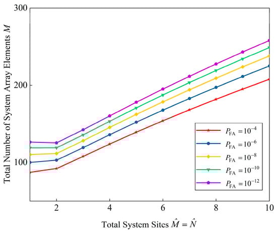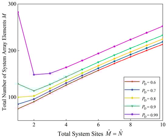 In Figure 13, the element volume of the radar system M curves versus system diversity . The optimal radar system design is given according to (42). Also, the result with respect to are all provided. Obviously, the higher the detection probability, the larger the amount of radar element required. When the exceeds 0.8, the number of required T/R array elements first decreases and then increases with the number of division sites. Herein, the optimal division site number is 2. Conversely, when is less than 0.8, the optimal array element configuration scheme is . That is, the PA-MIMO is configured as a phased-array radar without diversity.