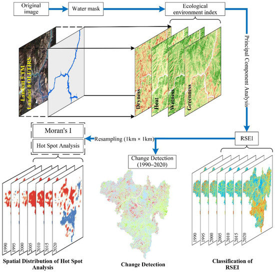 The process of this study is depicted in (Figure 1). Firstly, we use Landsat 8 OLI/TIRS and Landsat 5 TM images with the GEE platform to produce 30-m RSEI images of the 7 periods in 1990/1995/2000/2005/2010/2015/2020, respectively. Secondly, Moran’s I index (global Moran’s I) and hot spot analysis are used to perform spatial autocorrelation analysis on the seven RSEI images from 1990 to 2020. Finally, an ecological quality change detection was carried out for the period 1990–2020.