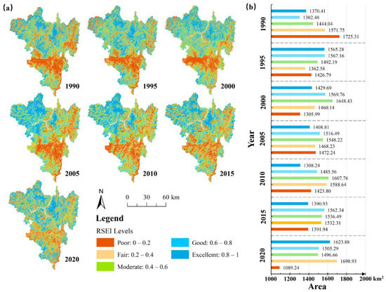 The RSEI Classification Results of Panzhihua City in 1990, 1995, 2000, 2005, 2010, 2015, and 2020. (a) Spatial Distribution Map of RSEI. (b) Area of RSEI Classification Results.