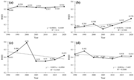 1990–2020 RSEI Mean Line Graph (a): Panzhihua, (b): Zhulan Mine, (c): Baima Mine, (d): Panjiatian Mine).