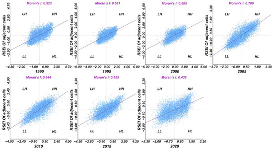 Scatterplot of RSEI Moran’s I in Panzhihua in 1990, 1995, 2000, 2005, 2010, 2015, and 2020.