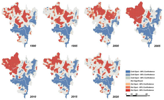 Spatial Distribution of Hotspots and Coldspots in Panzhihua City, 1990–2020. Note: Cold Spot-99% Confidence and Hot Spot-99% Confidence mean that the samples have a statistical significance with 99% confidence, while Not Significant shows that the samples are not statistically significant.
