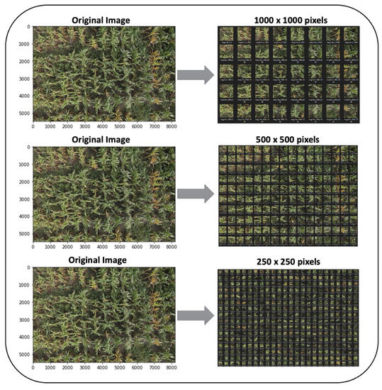 The UAS-acquired images from different dates were first split into a total of 3486 tiles using tile segmentation. The images were split into tiles of sizes 250 × 250 pixels, 500 × 500 pixels, and 1000 × 1000 pixels to prepare the datasets for training deep learning models. Each original image of size 8192 × 5460 pixels was first split as per the three tile sizes, resulting in a total of 672, 160, and 40 images, respectively (Figure 2). Each tile was manually labelled as diseased, healthy, or background and organized into training and testing folders using a 50–50% training–testing split ratio to train deep learning models. Overall, the datasets corresponding to images of sizes 250 × 250 pixels, 500 × 500 pixels, and 1000 × 1000 pixels comprised 1804, 1112, and 570 images, respectively (Table 1).