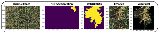 Superpixels are segments of an image created by grouping together different pixels within an image into perceptually meaningful atomic regions that may be similar in color, texture, and shape [38]. Although different algorithms exist for creating superpixels, simple linear iterative clustering (SLIC) segmentation is a popular and computationally efficient method to segment an image into multiple superpixels [36].