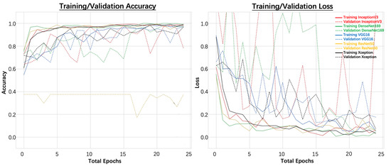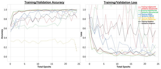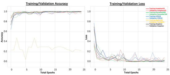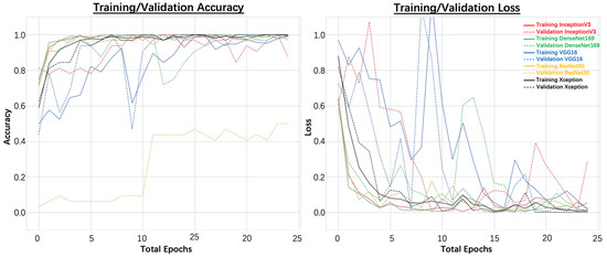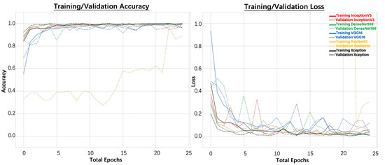 In addition, the testing accuracies and testing losses were also obtained using the testing dataset, as shown in Table 3. It was observed that 100.00% testing accuracy was achieved for the VGG16, DenseNet169, and Xception models. The lowest testing loss was achieved for the Xception model. Therefore, when a tile size of 250 × 250 pixels was used, the Xception model performed the best.