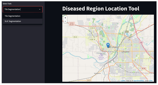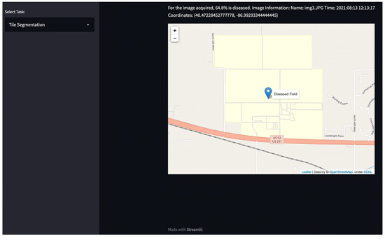 The application’s home page displays the title and consists of a map with a pinpoint on the locations of the farms or fields where data were collected. In addition, the drop-down box on the top left of the screen prompts the user to select the type of different segmentation algorithm, as shown in Figure 10. If the user selected the tile segmentation algorithm, as shown in Figure 10, the best model that achieved the highest testing accuracy was used for identifying the diseased regions.