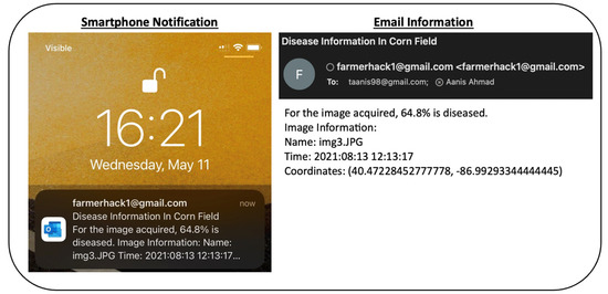 Using the “Exif” library from Python, the name of the image, the time at which the image was acquired, and the RTK geolocation coordinates at which the image was acquired were extracted. The area of the diseased image and the Exif information obtained from the image was then sent to the user via email. The “smtplib” library from Python for setting up an SMTP server was used to send email notifications. For this study, a temporary Gmail account named farmerhack1@gmail.com was created to send emails with information corresponding to diseased regions identified from UAS imagery acquired in corn fields.
