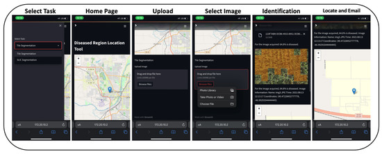 After training and comparing the deep learning models for accurately locating and identifying diseased regions within corn fields from UAS imagery, a disease region identification tool named Geo Disease Location System (GeoDLS) was developed for use via web browsers and smartphones. The “Streamlit” Python library was used for creating the application. Streamlit is a library that helps to easily deploy deep learning models for various tasks. In addition, Streamlit offers multiple additional promising tools to help users easily upload images for analysis.