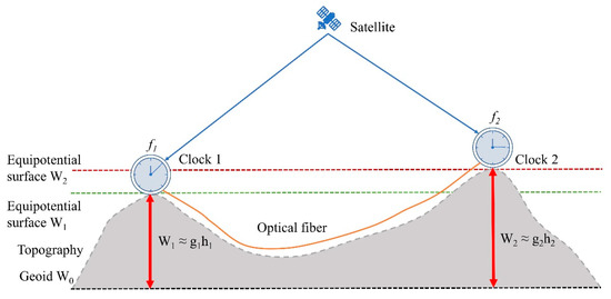 According to the gravitational redshift effect from general relativity, clocks tick faster for higher latitude, which can establish the relationship between the height and frequency [9,11]. This method is now known as chronometric leveling [28]. The essence of chronometric leveling is the geopotential difference observation. Because the conversion process between geopotential and height is relatively mature, chronometric leveling can also be regarded as a height measurement method. Its principle is shown in Figure 1. If locations 1 and 2 each have a clock, with frequencies of f1 and f2, the frequency difference between the clocks can be determined by frequency transmission techniques such as optical fiber or satellite. The gravitational potential difference and height difference between the two points can be obtained as follows [3,9,29].