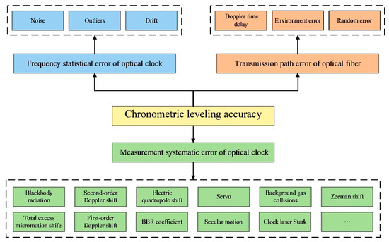 (1) The measurement systematic error of the optical clocks may depend on the performance of the instrument and operating environment and the measurement systematic error of the current highest precision optical clock can reach 8.6 mm. The systematic error is the systematic frequency shift caused by the electric field, magnetic field, temperature, and so on, which could be evaluated and corrected to a certain accuracy through quantum technical means. The measurement systematic error mainly depends on the performance of the optical clock used. The corresponding height difference of the existing optical clock with the highest accuracy could reach 8.6 mm. With the progress of quantum technology and laser science, more optical clocks with higher accuracy may appear to serve the chronometric leveling.