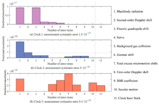 The measurement systematic error of the optical clock depends on the overall design of the optical clock and the operating environment, which may dominate the accuracy of the height measurement. We assume four typical optical clocks with accuracy ranging from 10−17 to 10−19, which are named Clock 1~4. The systematic error sources and values of Clock 1~4 are shown in Figure 4 and Table 1. Both Clock 1 and 2 are 40Ca+ optical clocks developed by APM [18,36]. The former is a miniaturized transportable optical clock, and the systematic error reaches 1.3 × 10−17. The latter could only be operated in the laboratory with larger volume, but the measurement systematic error reached 3 × 10−18. Clock 3 is the most accurate optical clock so far developed by NIST [16]. Clock 4 is an ultra-high precision optical clock that we assume may be realized in the future. The measurement systematic error reaches 3 × 10−19, the corresponding height error approximately 0.0028 m. If chronometric leveling is achieved by using a pair of Clock 1~4, the total measurement systematic error can be ranging from 0.1686 m to 0.0040 m.