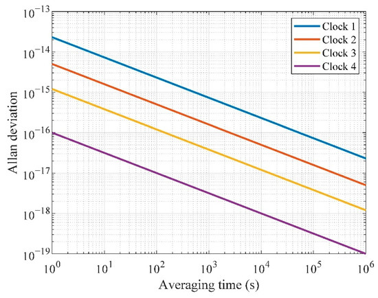 The frequency statistical error comes from the dynamic change of the output frequency of the optical clock, which is closely related to the design of the optical clock and the clock laser used. In the following, we assume that the sampling frequency is 1 s and the output frequency conforms to the normal distribution. Currently, the Allan deviation is equal to the uncertainty value in the measurement. We select three existing optical clocks with different short-term stability, and look forward to the short-term stability that optical clocks can achieve in the future. Since the systematic measurement error of the optical clock has a certain correlation with its frequency statistical error, the selected optical clock is consistent with that described above. The specific relationship between the frequency statistical error and averaging time is shown in Figure 5 [16,18,36]. The lowest and highest stabilities in a second reach 4.8 × 10−15 and 1.0 × 10−16, respectively, and with the increase of the averaging time, the accuracy improves continuously. When the averaging time is set as 106 s, the corresponding fractional uncertainty and the corresponding height error are shown in Table 2. Clock 1 has the largest statistical error, corresponding to a height error of 0.0440 m, while Clock 4 has the lowest statistical error, corresponding to a height error of about 0.0009 m. However, in practice, two optical clocks are required to realize the chronometric leveling, and the total statistical error will be the superposition of two independent error terms. The final statistical error and height error need to be multiplied by . The height error using two Clock 1 will reach 0.0624 m, and the same as Clock 4 will reach 0.0013 m. The frequency statistical error using a pair of Clock 2 or 3 are 0.0385 m and 0.0156 m, respectively.