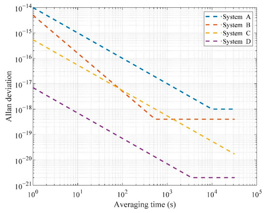 The magnitude of transmission path error has an important impact on the realization of high-precision height measurement. We choose four proven optical fiber frequency transmission systems with accuracy ranging from 10−18 to 10−21, which are named as Systems A~D, respectively [35,47,48,49]. The error models between accuracy and averaging time of different optical fiber frequency transmission systems are shown in Figure 6. By analyzing Figure 6, we may conclude that the uncertainty of different optical fiber systems has a linear relationship with time. When the average time is 2 × 104 s, the system noise floor may be achieved. The error model transmission distance and error model, system noise floor, and corresponding height uncertainty are shown in Table 3. All of Systems A~D could complete hundreds of kilometers of frequency transmission with uncertainty of 2 × 10−18 to 2.1 × 10−21, with the corresponding height uncertainty ranging from 0.0183 m to negligible 0.00002 m. Optical fiber frequency transmission systems with different accuracy serve different optical clock comparisons with different accuracy.