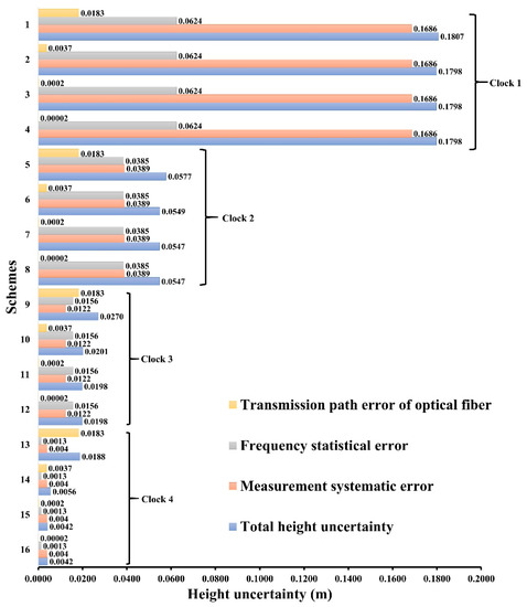 Based on the above 16 schemes, we could conclude that the specific accuracy results are those shown in Table 5 and Figure 7. The results of Table 5 and Figure 7 could be understood as follows: the first column is the serial number of our theoretical schemes. Each scheme includes a pair of optical clocks and the corresponding optical fiber frequency transmission system, which corresponds to Table 4. By changing the optical clocks and optical fiber frequency transmission systems, the measurement with different accuracy can be realized finally. The second column and the third column are the systematic errors of the optical clock used in the scheme and their corresponding errors, and their sources and uncertainties are detailed in Table 1. The fourth column is the statistical error of the output frequency of the optical clock. The mathematical model and the preset accuracy are described in detail in Table 2. The fifth column is the transmission error of optical fiber transmission systems A~D, which is from the last column of Table 3. The sixth column is the total error obtained by the errors from the third column to the fifth column according to the covariance propagation law. For instance, scheme 1 in Table 5 includes two clock 1 and OFFT system A. The systematic error of two clock 1 is 0.1686 m (Table 1), the statistical error is 0.0624 m (Table 2), and the transmission path error is 0.0183 m (Table 3). According to the covariance propagation law, the uncertainty of scheme 1 may achieve 0.1807 m. In addition, we draw the following conclusions by analyzing Table 5 and Figure 7: