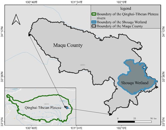 Located on the eastern part of the QTP, southern part of Gansu Province, at the junction of Gansu, Qinghai, and Sichuan provinces (33.03–34.23°N, 100.46–102.29°E), Maqu County is an important national ecological function reserve in China (Figure 1). The Maqu wetlands are an important water-conserving area in the upper reaches of the Yellow River. This area contains a large number of swampy wetlands and alpine meadows, is rich in surface water, and is the largest wetland in the source area of the Yellow River.