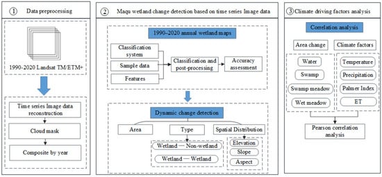 The workflow of this study can be divided into three main parts (Figure 2). First, the long-term Landsat time series image data for 1990–2020 were reconstructed and composited by year. Second, based on the alpine wetland classification system, we used the random forest algorithm to classify the long-term time series image data and to obtain classification maps of the Maqu wetlands from 1990 to 2020. Then, we analyzed the changes in the wetland area, type, and spatial distribution. Finally, we explored the relationship between climate change and the changes in the area of the alpine wetlands.