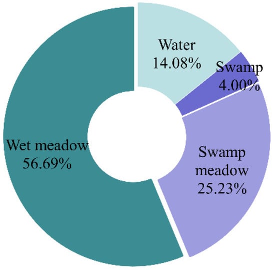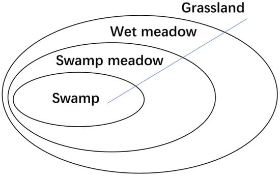 Due to the complexity of the composition and actual distribution of the different types of wetlands, it is difficult to reach a consensus on the definition and boundaries of wetlands []. In terms of the spatial distribution pattern, the geographic features exhibit a succession from swamp to swamp meadows to wet meadows []. Ideally, as shown in Figure 3, the swamp is the center from which the wetlands spread outward. However, the actual distribution does not have such a clear boundary. The main differences between these three types of wetlands are in their water contents and vegetation type []. From the perspective of the water content, the swamp is characterized by saturated soil conditions and soil moisture contents of 92–112%. The soil moisture content of the swamp meadow is 89–97%, which is drier than the swamp, but there are still some places where water accumulates throughout the year. Only a small part of the wet meadow is inundated during the rainy season, with soil moisture contents of 34–43%.