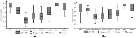 User accuracy and producer accuracy for each class. (a) user accuracy, (b) producer accuracy.