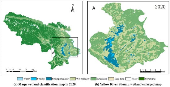 The annual wetland classification maps for Maqu wetland from 1990 to 2020 based on the RF method are shown in Figure 5 and Figure 6. Figure 5 shows the classification map of the Maqu wetlands for 2020. The enlarged map on the right shows the details of the wetland classification in the Yellow River Shouqu wetland. Figure 6 shows the classification maps of the Maqu wetlands from 1990 to 2019, which exhibit spatial consistency. These maps illustrate the dynamic changes during the past 31 years.