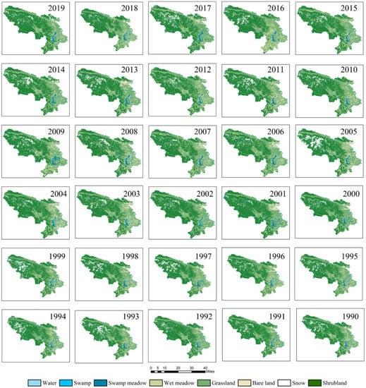 Obtaining a long-term continuous annual dataset for wetlands and their changes is a huge challenge. Wetland information is usually given in statistical yearbooks for many years, and land surveys are not very detailed in terms of wetland classification. Analysis based on satellite remote sensing images provides a cost-effective and convenient method for continuous monitoring of wetland changes. In this study, a unified classification system was applied to classify the Maqu wetlands from 1990 to 2020. The accuracy of the annual classification results largely depends on the number and quality of the sample points used to train the classification model []. In time series wetland classification, how to apply samples to images from different historical periods is a very important problem []. Obtaining samples through visual interpretation year-by-year is a time-consuming and labor-intensive process. Making full use of existing sample sets can effectively save time and reduce the workload. Therefore, in this study, a set of samples for 2020 was used as the benchmark, and the sample migration method based on reclassification was used to update and check the sample data of the first 30 years. The overall classification accuracy of all of the classification maps was greater than 84%.