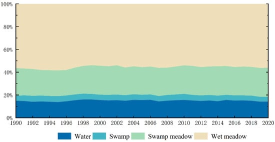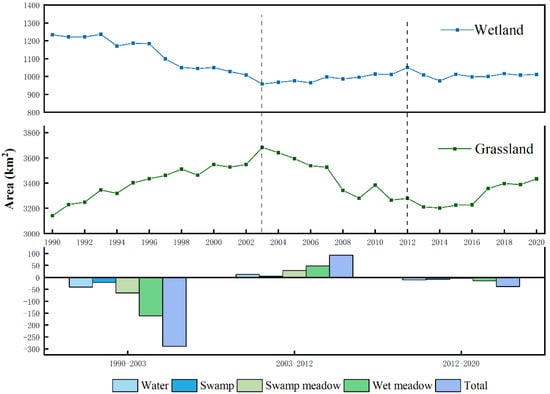 Overall, the wetland area fluctuated and eventually decreased, while the grassland area fluctuated and increased, which is consistent with the law of land class succession. Among them, the area of the wet meadow changed the most. As the transition zone between wetland and grassland, the area of the wet meadow will change more under climate change.
