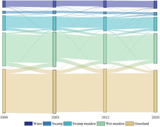 To more visually represent the direction and proportional area of wetland changes during the past 31 years in Maqu, the Sankey diagram was used to quantify the changes in the wetland types during the different periods (Figure 10). In the first stage, from 1990 to 2003, the swamp was in a state of net loss and was mainly transformed into swamp meadow. The wetland area fluctuated widely, the wet meadow was converted to grasslands, and under natural conditions, many alpine meadows were severely degraded when the depth of the water table exceeded the root depth. In the second stage, from 2003 to 2012, the marsh area in the study area increased slightly, the transfer-in area was larger than the transfer-out area, and part of it was transformed through conversion of swampy meadows. In the third stage, from 2012 to 2020, the swamp meadow was mainly transformed into wet meadow, and the total wetland area fluctuated less. The area of wet meadow transferred out was larger than the area transferred in, which eventually caused a decrease in the area of wet meadow, which was mainly transformed into grassland.