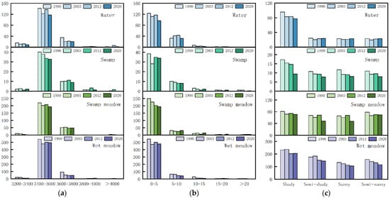 Wetlands exist on slopes with all aspects but were more prominent on slopes with certain aspects. The same elevation data were used for the aspect analysis; the aspects were divided into shady slopes (315–45°), semi-shady slopes (45–135°), sunny slopes (135–225°), and semi-sunny slopes (225–315°); and the wetland mapping results were overlain on the slope aspect data to analyze the distribution of the wetland area on slopes with different aspects during the different periods. In general, the distribution of the wetlands with different aspects was more uniform than the distributions of the altitude and slope. The water bodies were more concentrated on the shady slopes, and the areas of the water bodies distributed on the semi-shady and semi-sunny slopes were nearly equal. The distribution of the swamp was similar to that of the water bodies. The area of the wet meadows distributed on the shady, semi-shady, semi-sunny, and sunny slopes decreased sequentially. The distribution of the swamp meadow was almost equal for all four aspects. The relationship between the wetland loss and the slope aspect can be explained by the differences in solar radiation due to the topography, with a greater reduction in wetland area on shady slopes than on sunny slopes.