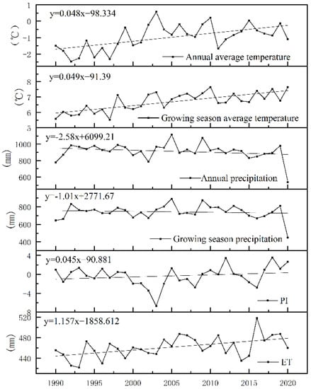 The climate change characteristics in Maqu County over the past 31 years are shown in Figure 12, and the continuous data are linearly fitted. Based on the fitted trend line, the annual precipitation and growing season precipitation exhibited weak decreasing trends, with rates of change of −2.58 mm/10 a and −1.01 mm/10 a, respectively. The annual average temperature and the average growing season temperature exhibited overall increasing trends, with rates of change of 0.48 °C/10 a and 0.49 °C/10 a, respectively. The PI exhibited a relatively stable trend, and the ET exhibited a weakly decreasing trend.