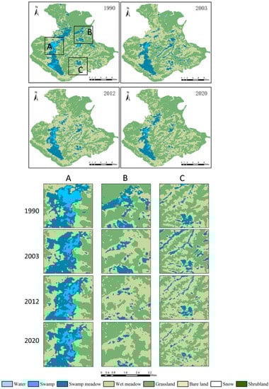 Distribution and local enlarged details of wetlands in the four periods (A–C) represents three different local enlarged details of wetlands in 1990, 2003, 2012 and 2020).