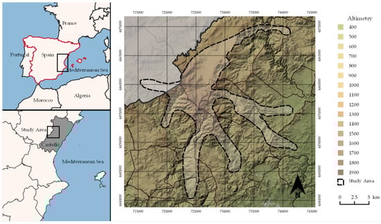 This study focuses on the northern mountain areas of the Valencia Region, located in the east of Spain (Figure 1). The orography varies from 0 to 1814 m.a.s.l. The area under study, extracted from a study of visual basins of the orography, has a surface of 269.16 km2. This territory is known locally as the Penyagolosa Mountain area. The combined population of the ten villages that form this landscape does not exceed 5000 inhabitants. The area hosts remains of cultural and natural consolidated legacies, dating back to the earlier periods when Penyagolosa was first occupied during the 13th century. Since then, the cultural landscape has stratified and the natural landscape has evolved accordingly. Nowadays, this landscape is experiencing a gradual but steady process of depopulation.