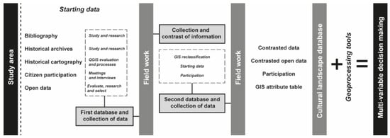 In this context, in order to elaborate a methodology that links architectural–ethnographic elements with natural values, it is essential to know the sources of information available. In this case, the study was drawn up from five sources: historical maps and archives, citizen participation, fieldwork, and open databases. Based on this, the scientific value of raw data collected was further analysed to make these scalable to other locations. The main objective of this phase was to determine the communication itineraries along which natural and cultural heritage merged in a shared space. To do so, the work was divided into three parts: documentation, fieldwork data collection, and GIS analysis (Figure 2).