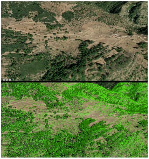 The value of LiDAR in this study relied on observing and understanding the spread of vegetation over pieces of land that were previously occupied by humans through the analysis of vegetation layers, low, medium, and high vegetation density. The study provides relevant insights that were integrated in the valuation of settings and itineraries. Figure 5 shows a three-dimensional photographic image where vegetation encroaches upon past agro-pastoral landscapes. LiDAR helped researchers visualise this effect by filtering vegetation as point clouds via satellite images. The data obtained from LiDAR are current as no earlier data are available. However, all analyses require a starting point and initial monitoring. The coincidence between the abandoned architectural elements and the higher density of vegetation points is also noteworthy. With sufficient data contrast, this gives a proportional and direct relationship between the location of construction and the state of its surroundings when cartographically, it can be confirmed as a cultivated area (either by the Corine layer or by the morphology of the terrain) and its state of conservation is specified.