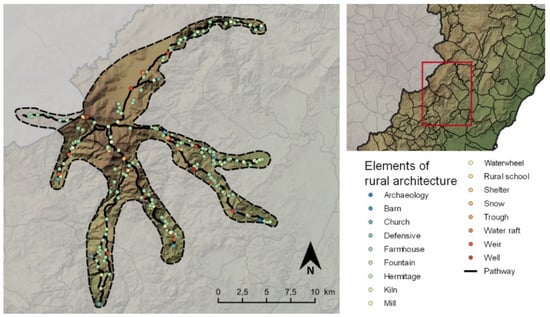 Fieldwork provided us with several elements scattered in the landscape. The information necessary to define and classify these was backed by the existing levels of protection. The information is summarised in Table 1, which shows the distribution of elements by type. Farmhouses stand out with 121 elements in very different states of conservation. There is a significant number of water-related elements (68), which are predominantly associated with farmhouses. The number of religious assets (20) is also considerable. While there is one church per village, this is not the case with hermitages, being less than one per village.