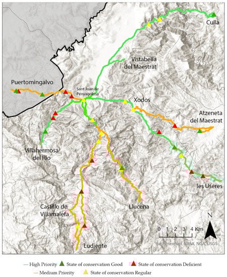 To classify and map the elements, the rubric layer for their conservation state and the one for intervention priorities were cross-referenced. The importance of intervention was prioritised according to the relevance of cultural elements and the natural area surrounding them. Itineraries and settings with high biodiversity in an outstanding natural environment were valued as high priority. Medium priority was attached to itineraries and settings with high biodiversity in an environment that is not outstanding in social, cultural, or natural terms. Finally, low priority was assigned to the rest of the assets. Researchers added all these valuation remarks as an attribute table in ArcGIS Pro software.