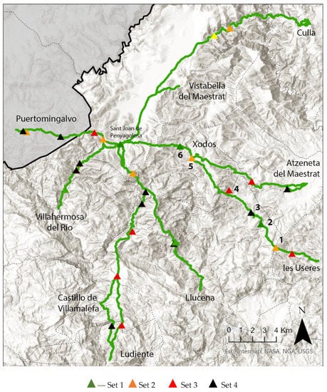The steps carried out in the methodology applying quantitative data to the study territory—and the response to certain data given that this is a constructed landscape—can be subject to a qualitative evaluation and linked to the first (social) steps of the research. To establish the protection and value criteria for the elements, the following were weighted: (1) the possible proximity of catalogued birdlife or birdlife of interest depending on the existence or not of suitable habitats nearby; (2) the accessibility to the cultural and natural setting; and finally, (3) the potential effect of tourism, as well as the occasional pressure of visitors throughout the year. The application of these three criteria resulted in four types of settings, classified according to their state of conservation and potential threats. Researchers explain the assessment process taking those from the Les Useres itinerary as an example (Figure 9).