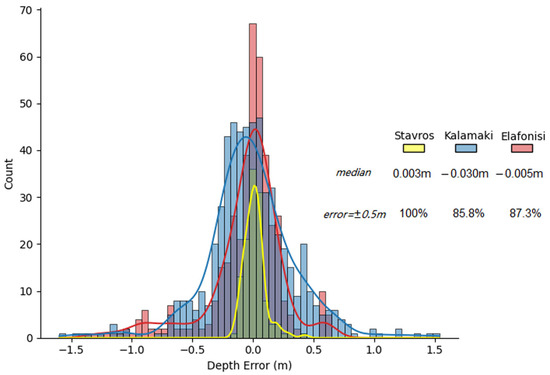 To assist better the evaluation of potential sources of error, Figure 7 shows the spatial distribution of residuals overlaid on RGB orthomosaics. Test points with large absolute value of residuals appear in a few instances over deep, rocky places of the Kalamaki and Elafonisi areas. A possible explanation could be that in rocky areas there are often dark or shaded parts of the seafloor, which may have led to erroneous bathymetric predictions. This issue was also encountered in the study of [37] where, similarly, large errors occurred over shaded patches in rocky areas. At the Stavros area, the few outliers that appear on the map are attributed to random noisy measurements, as the max absolute error values are generally low (0.4 m) compared to the other two areas.